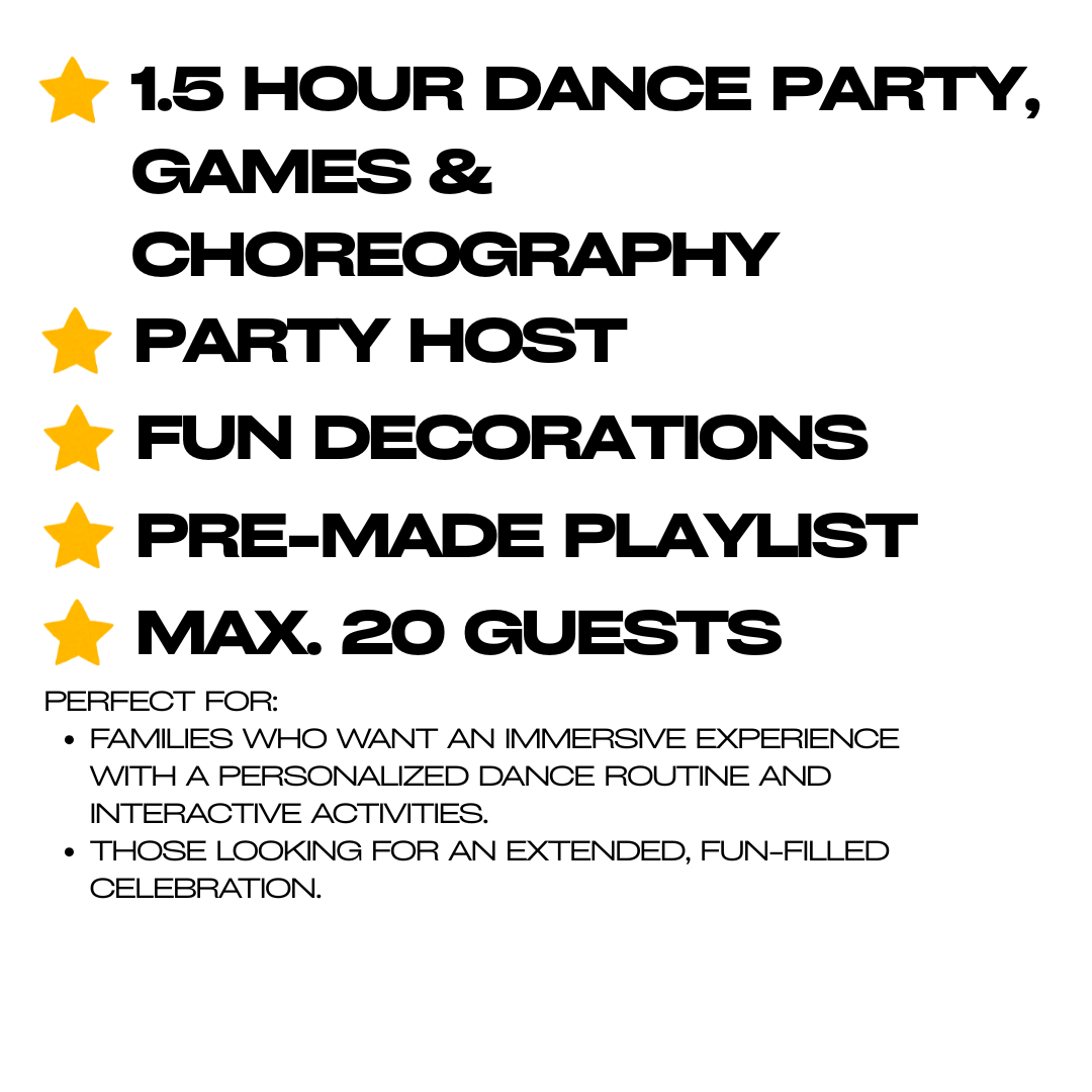 At Ace Dance Studios, our birthday parties are packed with music, dancing, and laughter — designed to keep kids moving, grooving, and having the time of their lives. With four party packages and exciting themed options to choose from, you can create the perfect celebration for your superstar.